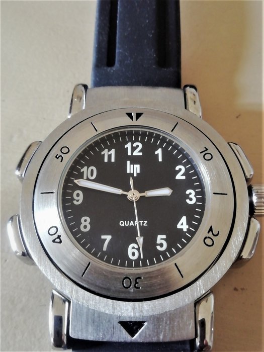 LIP CLASSICS horloge met kompas aan de onderkant, het horlogegedeelte is op een scharnier gemonteerd om het kompas te gebruiken zonder het horloge van de pols te halen.