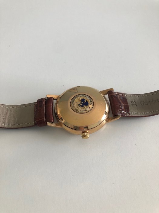 Merk en model horloge: Longines Conquest Armbanduhr Automatic ref 9025-13. Longines Conquest Automatic Waterproof polshorloge van 18kt goud in uitstekende staat, zelden gedragen en met zeer kleine gebruikssporen. Niet originele band en recentelijk vervangen. Mechanisme in perfect werkende staat. Met het bekende automatische kaliber 291 (gemaakt door Longines in 1958) is CAL 291 een van de beste automatische uurwerken. Kastdiameter Ø34 mm.