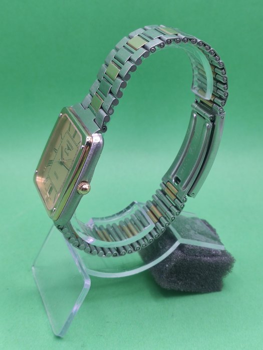 30mm stalen kast. met vergulde lunette en stalen armband van circa 18 cm. met veervouwsluiting.