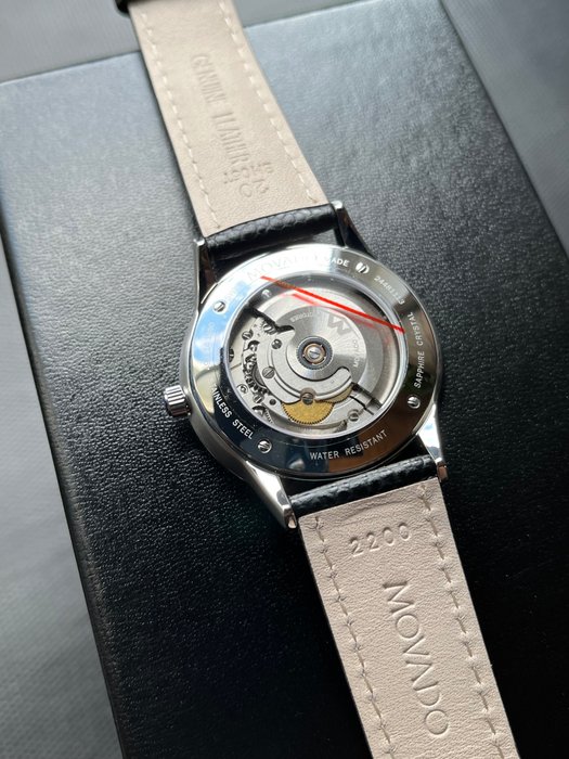 Te koop is dit nieuwe en ongedragen automatische (Zwitsers uurwerk) Movado horloge. Het heeft een roestvrijstalen kast van 39,5 mm, met een blauwe wijzerplaat (met gestempelde uurmarkeringen) en krasbestendig saffierglas. De Movado heeft een datumvenster op de 6 uur positie. Een ander mooi kenmerk is de achterwand van de tentoonstellingskast.