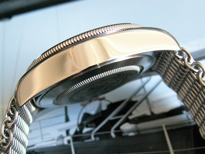 Prachtig en exclusief horloge met 904L edelstalen kast en edelstalen "mesh" band met veiligheidsvouwsluiting. Het horloge is verstelbaar voor polsen tot 22,5 cm omtrek. De kast meet exclusief de geschroefde kroon ca. 41mm met een dikte van ca. 14 mm en tussen hoorns 22 mm.