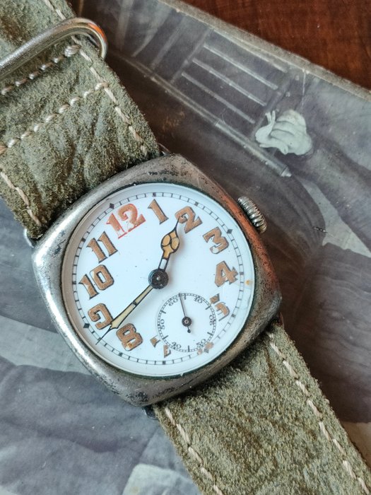 Zeer mooi oversized vintage swiss made TRENCH horloge uit Éra World War 1 in volledig originele staat in zilveren AG800 kast !!!