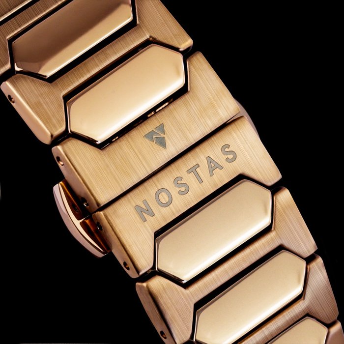 indexen en wijzers: aangebracht met superluminova in verticaal geborsteld roestvrij staal met roségouden PVD en Nostas-logo op 12 uur