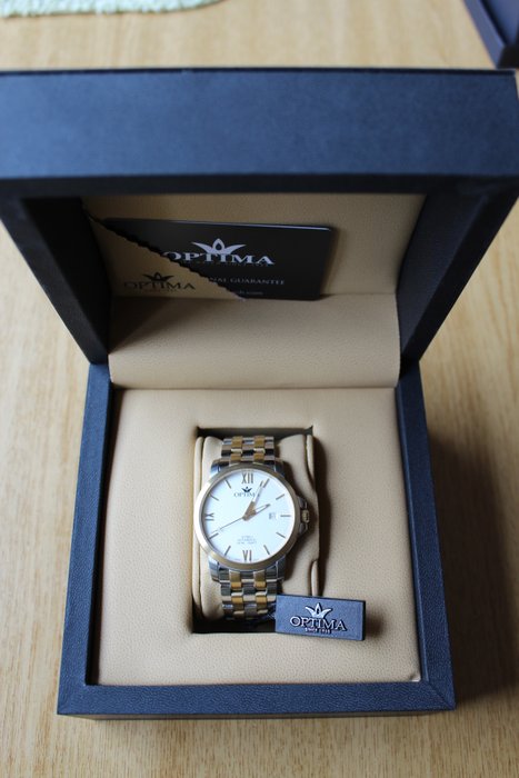 Wijzerplaat: Wit zand. Gouden PVD lume-gevulde wijzers, gouden PVD-indexen. ronde doos.