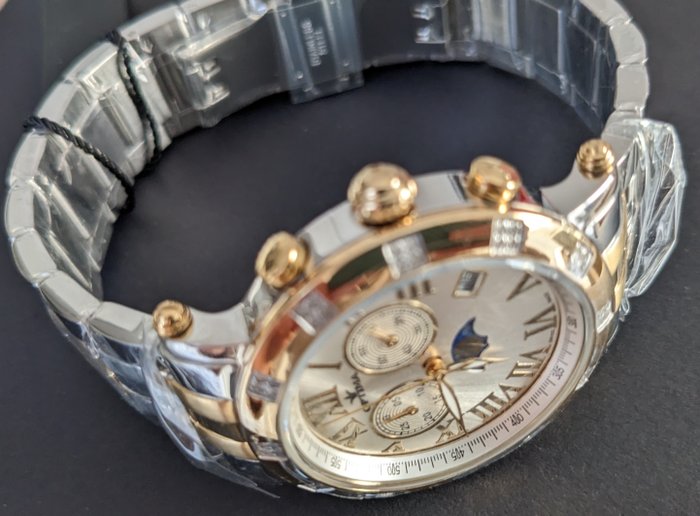 Functies: Centrale uren, minuten, stop seconden in het midden, 30 minuten teller op 9 uur, Kleine seconde op 3 uur, Maanfase op 6 uur. Datum om 4 uur.