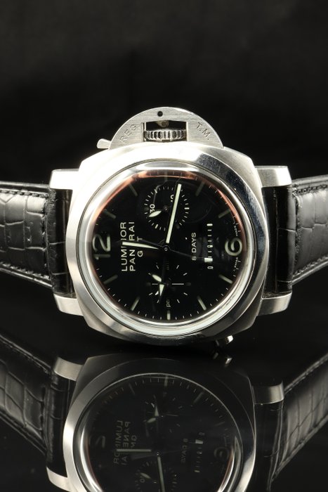 Panerai, "Luminor 1950 8 Days Chrono Monopulsante GMT" Pam275 in roestvrij staal, handopwindhorloge, heeft een 44 mm roestvrijstalen kast rond een zwarte wijzerplaat op een bruine alligatorband met een roestvrijstalen tanggesp. Functies omvatten uren, minuten, kleine seconden, chronograaf, GMT en gangreserve-indicator. Foto's maken deel uit van de omschrijving. Dit is alleen horloge, geen doos/papieren.