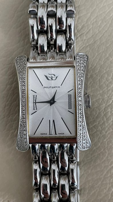 Occasion te koop voor de halve prijs Philip Watch quartz dameshorloge uit de Panama Diamonds collectie Rechthoekig stalen quartz uurwerk met gepolijste afwerking en gezette diamanten.