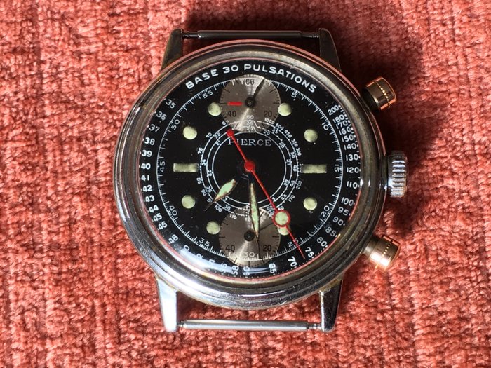 Hoewel ze buitengewoon verzamelbaar zijn, zijn Pierce-chronografen niet zo zeldzaam. Gesigneerde versie met het almachtige 134 pulsaties-kaliber dat tijdens de Tweede Wereldoorlog door Britse legermedici werd gebruikt. Het horloge bevat ook wat lijkt op de nylon nato-band.
