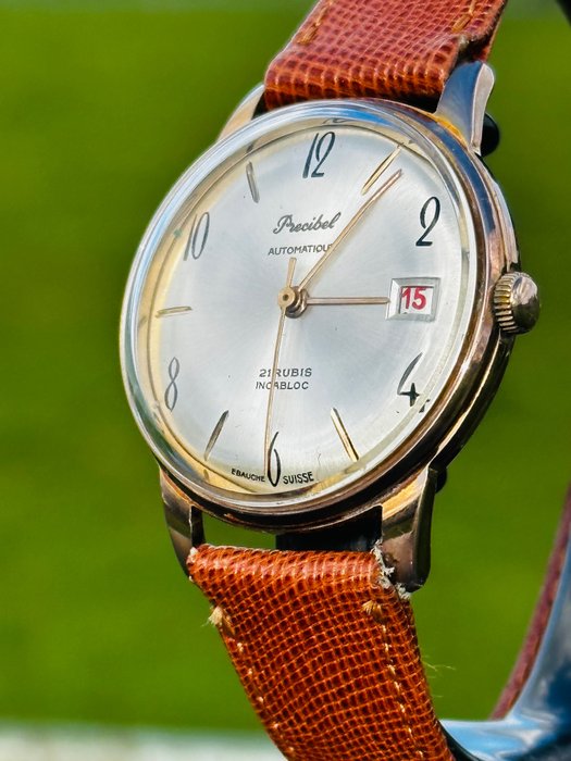 PRECIBEL SWISS horloge met nieuw leren bandje ( Max 21 cm), diameter zonder kroon 33,5 mm., doublé kast, datum, champagne wijzerplaat en uitstekend lopend automatisch uurwerk