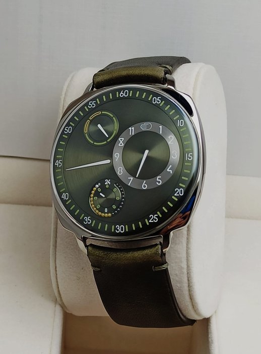 Deze Ressence Type 1 Slim X heeft een 42 mm Grade 5 titanium kast en een solide achterkant van de kast met ingebouwd instelmechanisme, allemaal op een olijfgroene leren band met een ardillon gespsluiting.