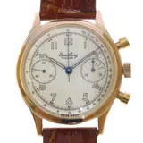 Presenting a superb men's wristwatch from the vintage retro era, circa 1945. Crafted in exquisite 18K rose gold, this timepiece embodies the bold and iconic Retro Art style. Its geometric forms and delicate floral details in pink gold are a testament to the fashion of that era. This watch, restored to perfection by Breitling Switzerland, boasts an excellent condition throughout. It's a timeless masterpiece, marked '18K' and '0.750', confirming its authenticity. Embrace the elegance of the past with this remarkable Breitling Premier timepiece.