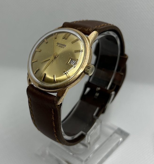 Schitterend klassiek vintage herenhorloge, Richard model, Swiss made 17 jewels handmatig opwindbaar mechanisch uurwerk.Het horloge is verguld.Over het algemeen zijn de esthetische condities goed, zoals te zien op de foto's.In werkende staat en onderhouden.Het horloge heeft geen originele doos, daarom verbindt de winnaar van de veiling zich ertoe het item precies te kopen zoals op de foto. Ik verzend alleen met aangetekende post. Uiterst zorgvuldige verpakking. Kastafmetingen inclusief kroon: 36,5 mm. Voor meer informatie kunt u contact met mij opnemen.