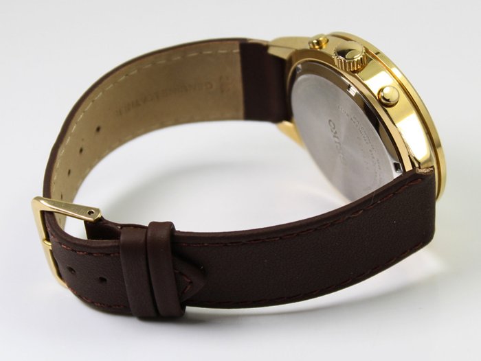 Een mooi Seiko chronograaf horloge met gouden wijzerplaat in uitstekende staat. Nieuwe bruine lederen band van goede kwaliteit die aan het horloge is bevestigd