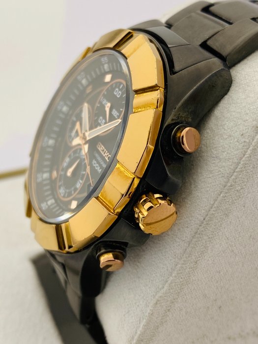 Een schattig horloge met chronograaf en datumfunctie. Het heeft een mooie uitstraling met zijn zwarte wijzerplaat en vergulde bezel. Er zijn gebruikssporen. (Zie foto's)