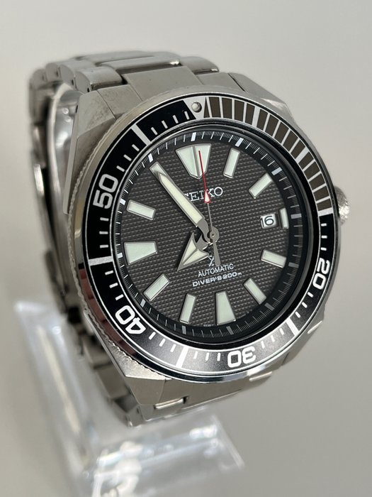 Seiko SRPF03K1 Samurai met Saffierglas en datumaanduiding aangeboden. Mooie donkergrijze wijzerplaat met 3D effect.