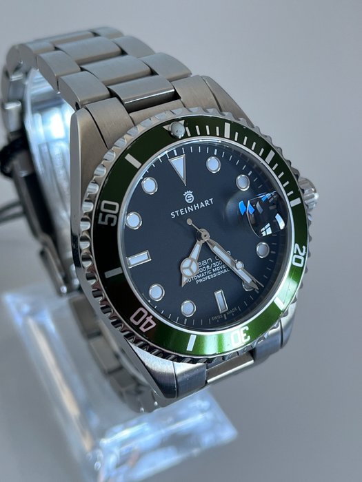 Steinhart Ocean One Green. Duikhorloge met automatisch uurwerk, krasvast saffierglas, metalen Jubilee band van zware kwaliteit waardoor dit horloge tegen een stootje kan.