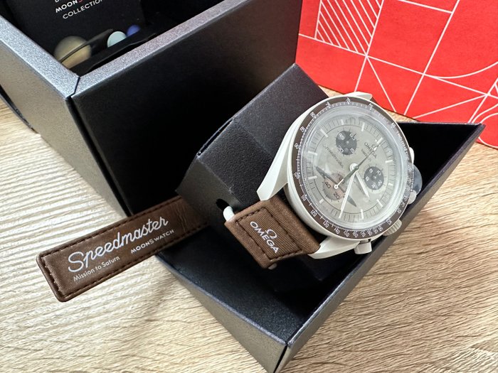 Op dit model contrasteren de zandbeige tinten mooi met een bruine wijzerplaat en VELCRO© band. De secondewijzer van de chronograaf, de tellerwijzers en de achterkant van de tachymeterschaal zijn ook bruin. De secondenteller stelt de ringen van Saturnus voor. Alle wijzerplaten zijn voorzien van het OMEGA X SWATCH-logo, samen met het iconische Speedmaster-logo en het nieuwe MoonSwatch-logo. De constructie van het glas, de "verborgen" S ingebed in het midden van het kristal, het fijne en verfijnde cirkelpatroon op de buitenste ring van de wijzerplaat en de tellers, de constructie van de randen die zowel schoon als glad zijn, de typische "point over 90" op de tachymeterschaal en natuurlijk het unieke biokeramische gevoel zijn hetzelfde voor alle modellen en vertegenwoordigen Swatch's toewijding aan detail. De uren-, minuten- en chronograaf-secondenwijzers, evenals de uurmarkeringen, zijn voorzien van Super-LumiNova-coating voor perfecte glans in het donker.