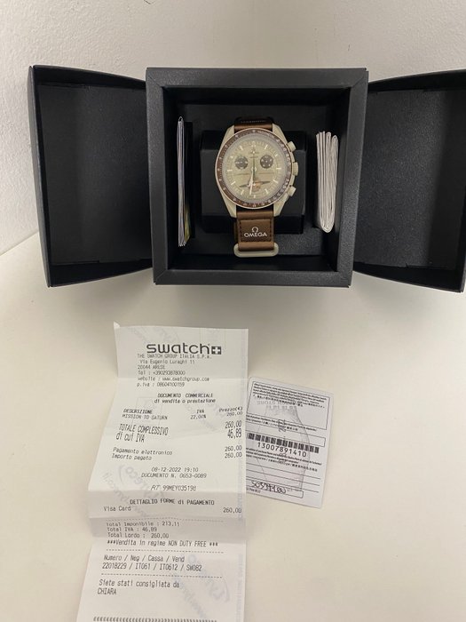 Missie naar Saturnus, zand- en beigetinten in contrast met de bruine wijzerplaat en klittenband. De secondewijzer stelt de ringen van Saturnus voor. Alle uren-, minuten- en secondewijzers van de chronograaf en de uurmarkeringen zijn voorzien van de Superluminova-behandeling, voor perfecte fosforescentie in het donker. Waterdicht tot 3 bar. Afmeting van het horloge 42 mm, dikte 13,25 mm, hoogte 47,30 mm. Conditie 10/10 nooit gedragen, alleen uit de doos gehaald voor foto's.