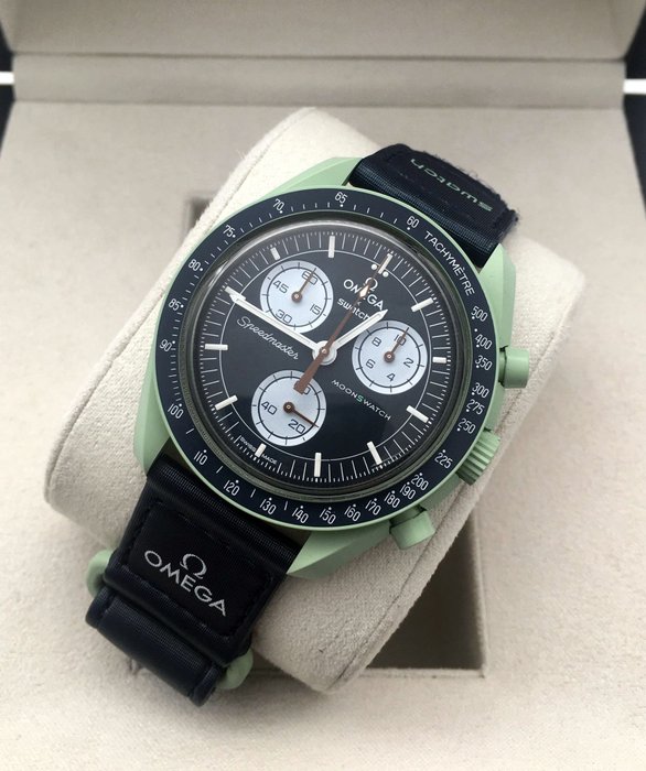 Eco-astronauten zullen dol zijn op dit aardse groene horloge met marineblauwe VELCRO©-band. De chronograaf secondewijzer en tellerwijzers zijn in bruin. De subdials zijn in het wit. Net als de tachymeterschaal op de blauwe randachtergrond. Alle wijzerplaten dragen de OMEGA X SWATCH-branding, evenals het iconische Speedmaster-logo en het nieuwe MoonSwatch-logo. De glazen constructie, de "verborgen" S geïntegreerd in het midden van het kristal, het fijne en verfijnde cirkelpatroon op de buitenste ring van de wijzerplaat en de subdials, de scherpe en gladde nokkenconstructie, het iconische "dot over 90" detail op de tachymeter geschaalde bezel, en natuurlijk de unieke biokeramische touch zijn gemeenschappelijk voor alle modellen en staan voor gepassioneerde liefde voor details. Alle uren, minuten, chronograaf secondewijzers en uurmarkeringen hebben superluminova voor een perfecte glow in the dark.