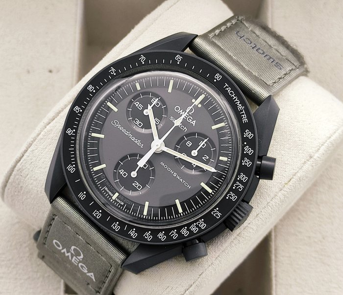 Met zijn intens diepgrijze kleur en metallic grijze VELCRO band, dit horloge betekent zaken. De chronograaf secondewijzer, subdial handen en tachymeter schaal zijn in het wit. De subdials en bezel achtergrond in zwart. Alle wijzerplaten dragen de OMEGA X SWATCH-branding, evenals het iconische Speedmaster-logo en het nieuwe MoonSwatch-logo. De glazen constructie, de "verborgen" S geïntegreerd in het midden van het kristal, het fijne en verfijnde cirkelpatroon op de buitenste ring van de wijzerplaat en de subdials, de scherpe en gladde nokkenconstructie, het iconische "dot over 90" detail op de tachymeter geschaalde bezel, en natuurlijk de unieke biokeramische touch zijn gemeenschappelijk voor alle modellen en staan voor een gepassioneerde liefde voor details. Alle uren, minuten, secondewijzers van de chronograaf en uurmarkeringen hebben een superluminova voor een perfecte glow in the dark.