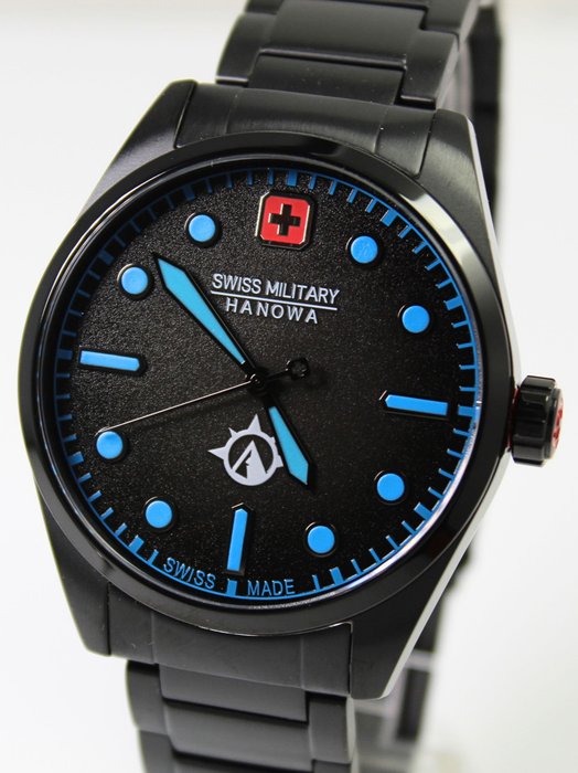Dit Swiss Military Hanowa luxe Swiss Made horloge heeft een zwarte PVD roestvrijstalen armband, saffierglas, 100 WR en een opvallende wijzerplaat met blauwe markeringen en wijzers.