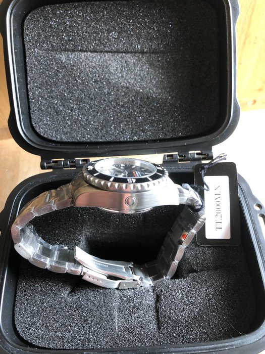 Tecnotempo duikerspolshorloge, gelimiteerde oplage, slechts 100 stuks. Het is een duikchronograaf, waterdicht tot 20 atmosfeer. Het horloge wordt geleverd met de originele verpakking en garantie vanaf december 2022. Nog origineel in cellofaan. Diameter kast 40 mm, 45 met de kroon. Roestvrijstalen armband., 22 cm. Het glas is van krasbestendig kristal, de bezel is duidelijk mobiel, het is echt een uniek en stijlvol horloge. Tecnotempo is een Italiaans bedrijf dat horloges van topkwaliteit produceert, vaak in beperkte oplage.