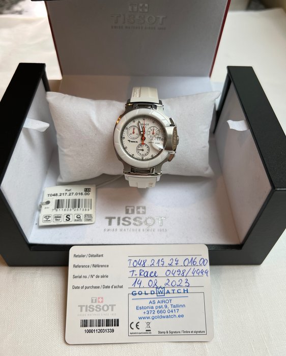 De Tissot T048.217.27.016.00 is een T-Race dameshorloge. Roestvrijstalen kast met een witte rubberen band en saffierkristallen. Witte wijzerplaat bezet met diamanten met oranje accenten. Quartz uurwerk op batterijen. Waterbestendig tot 100 meter / 330 voet. Ronde kastvorm. Kastmaat: 36,65 mm. Bandbreedte: 15 cm. Vouwsluiting met drukknopontgrendeling. Horlogelabel: Zwitserse makelij. T-Sport dameshorloge met witte wijzerplaat T048.217.27.016.00