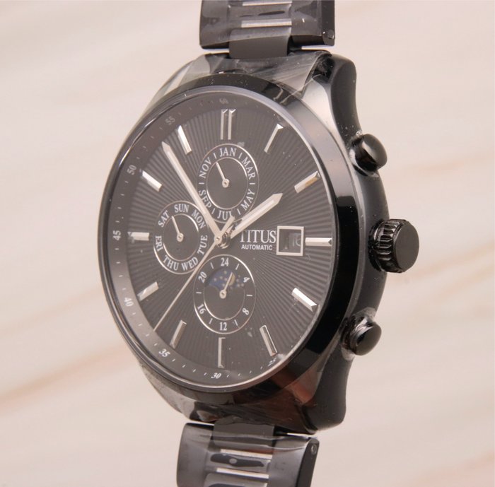 Model: Titus zwart/zwart wijzerplaat automatisch horloge met eeuwigdurende kalender