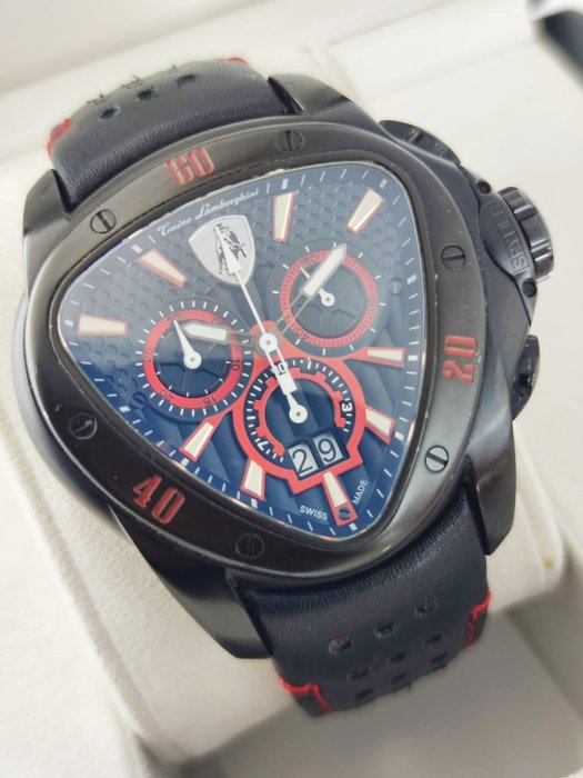 Roestvrijstalen kast met PVD-coating en zwarte lederen band. Lamborghini-logo op 12 uur. Minuutmarkeringen rond de buitenste cirkel. Zoektype: analoog. Lichtgevende wijzers. De datumweergave bevindt zich op de 6 uur positie. Chronograaf - drie weergegeven sub-wijzerplaten: 60 seconden, 30 minuten en 1/10e van een seconde. Kwarts uurwerk. RL 5050.B motor. Krasbestendig saffierglas. Stevige achterkant. Diameter kast: 50 mm. Dikte kast: 13,70 mm. Tonneau kastvorm. Distributie gesp. Waterbestendig tot 100 meter / 330 voet. Functies: chronograaf, datum, uur, minuut, seconde. Luxe horlogestijl. Horlogelabel: Swiss Made. Tonino Lamborghini Spyder