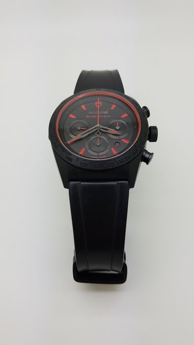 42 mm geparelstraalde kast van mat zwart keramiek, geschroefde kroon van zwart pvd-behandeld staal, gegraveerd met Tudor-logochronograafdrukknoppen in zwart pvd-behandeld staal op 2 uur en 4 uur snelle datumcorrector, matzwarte pvd-behandelde staal op 9 uur, waarvoor het tudor-gereedschap nodig is, vaste matzwarte keramische lunette met gegraveerde tachymetrische schaal, saffierglas, zwarte wijzerplaat met rode index, 30-minutenteller op 3 uur en 12-uursteller op 6 uur, kleine secondewijzer op 9 uur, datum op 4.30 uur, kaliber 7753 zelfopwindend uurwerk, ongeveer 46 uur gangreserve, zwarte rubberen band, vouwgesp en veiligheidspal. Waterbestendig tot 150 m (500 ft).