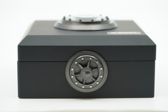 CASE: 46 mm AISI 316 Plus steel case. Polished tungsten top ring. Distinctive crown on left side with patented protection device. The bezel and case back are locked together by external tubing and a customised key that ensures total waterproofing. Oversized crown cap for easy handling, secured to the carrure in a protected position at 9 o'clock. Heat-treated steel winding crown. Chrono pushers secured to the carrure by screws (pusher at 10 o'clock with milled finish). Personalised rhodium-plated silver rotor with three-bridge construction and fixed with blue screws. A small window on the side reveals the movement inside.
