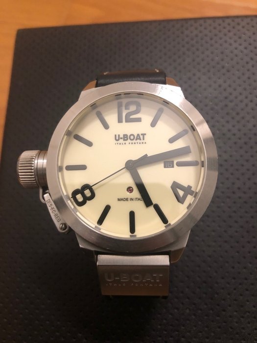 Beige wijzerplaat met zwarte wijzers en indexuurmarkeringen.