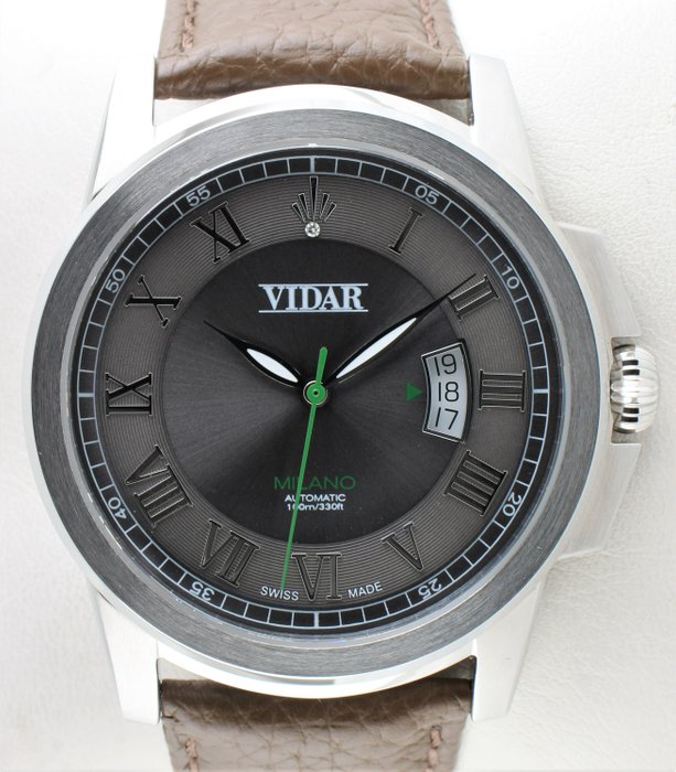 - gepolijste Romeinse cijfers en Vidar-logo met diamant op 12:00 uur
