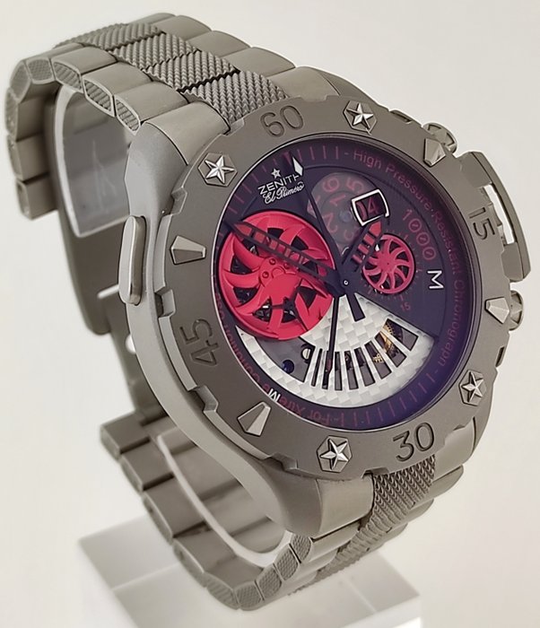 "Zeer opvallend en in het oog springend model. Prestigieus. Uit de Zenith Defy Xtreme-serie. Het is gemaakt om perfect te werken onder extreme omstandigheden en zeer hoge druk. Titanium kast die zo sterk is als staal en zo licht als een veertje."