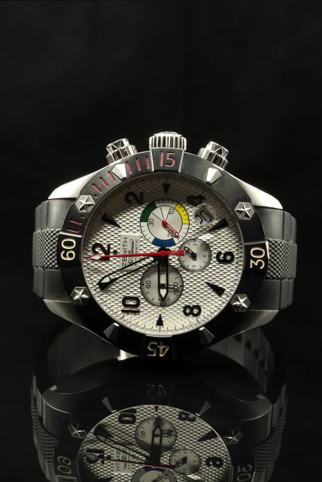 Zenith Defy Classic chronograaf: 03.0516.4.000/01.R642, roestvrij staal, zwarte rubberen band met tanggesp, unidirectionele draaibare lunette, zilveren geguillocheerde Arabische wijzerplaat, automatisch (El Primero 4000 SC), 12-uurs chronograaf, datum, display achterkant, geschroefde kroon, Breedte: 47 mm / Hoogte: 53 mm / Dikte: 17 mm / Lug Breedte: 23 mm