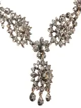 From the first glance it seems obvious that this frivolous red gold backed necklace fits just elegantly around the neck as a garland of six larger flowers alternating with six smaller ones. As three more flower pairs with dangling triplets drape from this blooming aura, an abundance of foil-set rose cut diamonds encrusted in silver shimmer illustriously.
