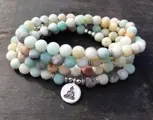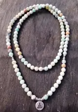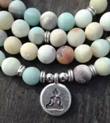 Aan deze prachtige mala hangt een mooie (dubbelzijdige) Boeddha bedel. De betiteling Boeddha verwijst naar een niveau van bewustzijn, maar is beslist geen titel. Met de naam Boeddha wordt vaak de stichter van het boeddhisme aangeduid: Gautama Boeddha. Uit de leer van de Boeddha zijn een aantal belangrijke lessen te leren, in het bijzonder als het gaat om onze eigen mentale processen. Uiteraard hebben we niet altijd invloed op wat ons overkomt, maar we hebben wel altijd een keuze in hoe we daar mee omgaan.
