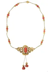 This French Antique Gold and Coral Cameo Necklace, hailing from the Romantic Victorian Period around 1850, is a stunning representation of the era's artistic expression. Crafted in 18K yellow gold, the necklace features a beautifully carved coral cameo, a technique that dates back to ancient times and saw a revival during the Victorian era. The coral's warm hues against the gold create a striking contrast, embodying the sentimental and symbolic themes prevalent in the period. This piece is not only a remarkable example of the intricate craftsmanship of the time but also a testament to the romanticism and devotion that defined the Victorian era.
