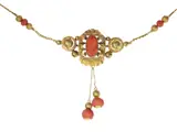 This French Antique Gold and Coral Cameo Necklace, hailing from the Romantic Victorian Period around 1850, is a stunning representation of the era's artistic expression. Crafted in 18K yellow gold, the necklace features a beautifully carved coral cameo, a technique that dates back to ancient times and saw a revival during the Victorian era. The coral's warm hues against the gold create a striking contrast, embodying the sentimental and symbolic themes prevalent in the period. This piece is not only a remarkable example of the intricate craftsmanship of the time but also a testament to the romanticism and devotion that defined the Victorian era.