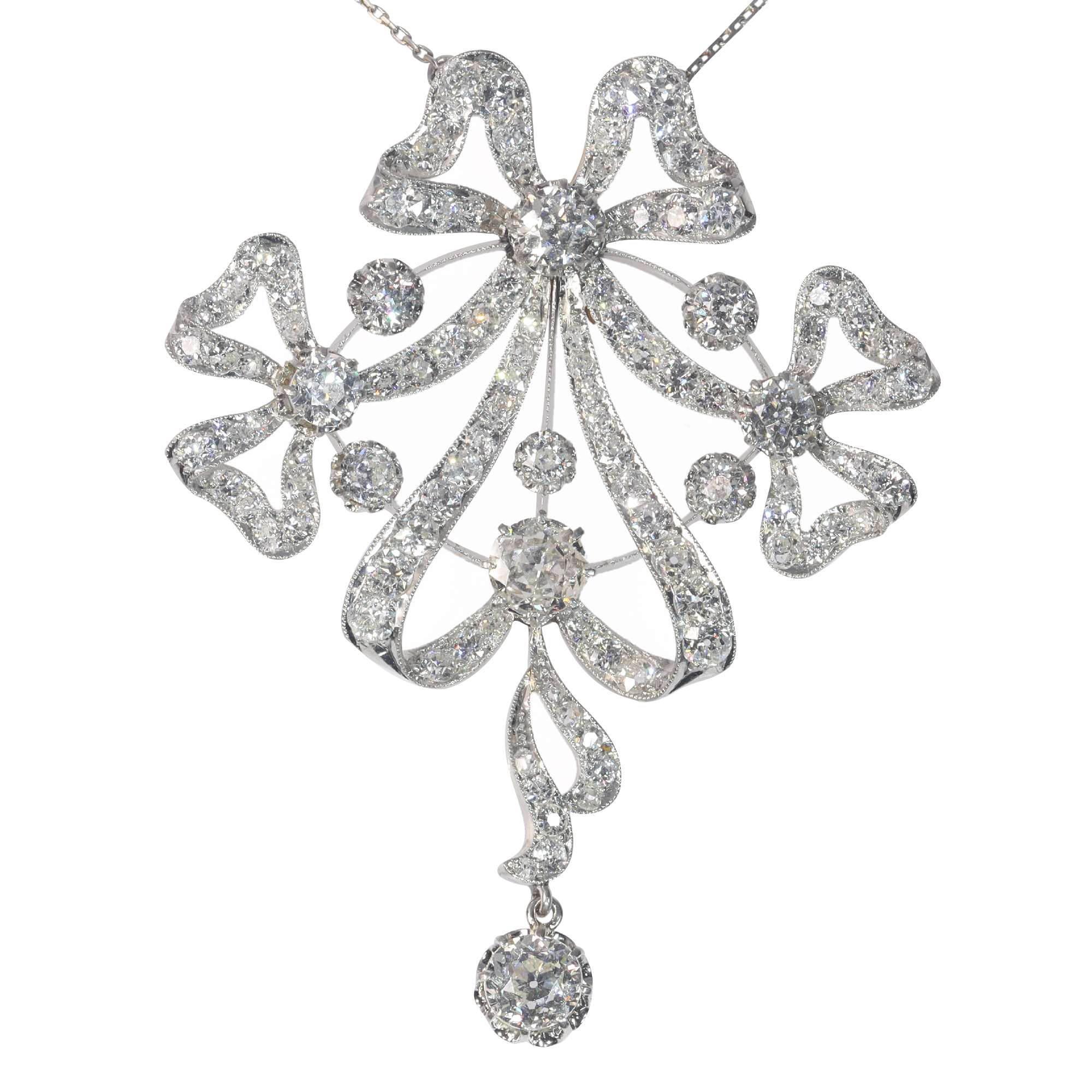 An heirloom of the Belle Époque, this ca. 1910 brooch-pendant on chain glistens with history, its 110 old mine brilliant cut diamonds totalling approximately 8.14 carats. Fashioned from platinum it epitomises the era's opulence, its design inspired by the elegance of ribbon bows. The ingenuity of its convertible design, transforming from brooch to pendant, speaks of a time when innovation met beauty. Though its origins are cloaked in mystery, the piece is a palpable echo of the 'Beautiful Era', a time capsule of splendour and the zenith of craftsmanship.