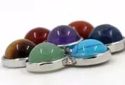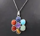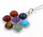 Deze mooie hanger bevat Amethist, Lapis Lazuli, Turkoois, Aventurijn, Tijgeroog, Jaspis en Carneool en hangt aan een verzilverde ketting met een lengte van circa 50 cm. De diameter van de hanger is circa 3,5 cm.