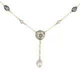 Indulge in the opulence of the Grand Victorian Period with this exquisite Antique 19th Century necklace. Crafted during the mid-1800s, it features a resplendent 3.60-carat old brilliant cut diamond and nine oval/pear-shaped diamonds totaling 1.68 carats. The piece also boasts rose cut diamonds and senailles, adding a touch of nostalgia. In its heart lies a 5.80-carat natural pearl with a subtle "pique," accompanied by eight more natural pearls. Crafted from 18K yellow gold, it showcases exceptional enameling skill on vertical surfaces. This necklace is a timeless testament to 19th-century craftsmanship and elegance, destined to be a captivating conversation piece while indicating the sophisticated taste of the wearer. Antique jewelry object group: necklace