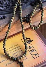 Deze prachtige mala is afkomstig uit Tibet en is circa 80 cm. lang. Het gebedssnoer is gemaakt van groen/bruine kralen (circa 0,8 cm.) die geregen zijn aan licht elastisch materiaal zodat de mala zowel als ketting, als om de pols gedragen kan worden.