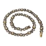 A resplendent late Victorian choker from the Netherlands, circa 1910, captivates with its intricate design inspired by the natural world. Crafted in 14K yellow gold with delicate silver details, this piece is a testament to the lavish ornamentation of the era. Embellished with 400 glittering rose-cut diamonds and complemented by twenty elegant pearls, it epitomises the Victorian fascination with floral motifs. Beyond its historical allure, this choker possesses an unparalleled beauty that, when worn, becomes absolutely stunning, transforming any ensemble into a statement of timeless elegance and sophistication. It stands as a beacon of the romantic, nostalgic, and admirable craftsmanship of its time.