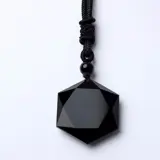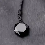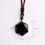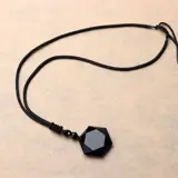 De geometrisch geslepen steen hangt aan een fraai geknoopt zwart koord dat in lengte instelbaar is van circa 44 tot 80 cm. lengte. De steen heeft een diameter van circa 3 cm.