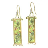 Within these picturesque Art Nouveau earrings crafted in 18K yellow gold and plique-à-jour enamel, a fleeting daydream of an iris meadow glistening of old mine brilliant cut and rose cut diamonds is captured by a glance through a windowpane. Almost whirling through the gold framework, these graceful irises are ever so eager to climb up their future goddess's neck.