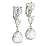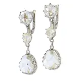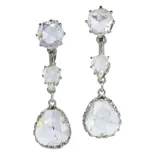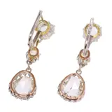 These stunning long hanging earrings, crafted from platinum and 18K yellow and red gold, elegantly bridge the refined artistry of the Belle Époque and the sleek, bold geometry of Art Deco. Highlighted by two exceptional pear-shaped rose-cut diamonds, totalling 2.91 carats, these jewels are further adorned with four additional rose-cut diamonds, bringing the total diamond weight to approximately 5.50 carats. The intricate settings complement the sparkling diamonds, creating an extraordinary balance ofsophistication and allure, making these earrings a timeless treasure from circa 1920.