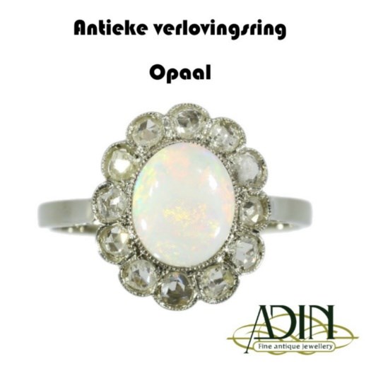 Vintage verlovingsring met oogverblindend mooie opaal en diamant