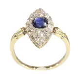 This early Victorian engagement ring, dating back to circa 1840, is a romantic emblem of the era's adoration for ornate and meaningful designs. Exquisitely crafted in 18K yellow gold, it features thirty old brilliant cut diamonds encircling a central, vivid blue sapphire. Its intricate artistry and the striking contrast of the vibrant sapphire against the glittering diamonds epitomize the Romantic Victorian Period's love for opulence and emotionality. This ring is not just a piece of jewellery but a cherished heirloom that has defied the years, tenderly passed down through generations, symbolizing enduring love and the timeless beauty of commitment.