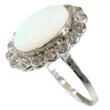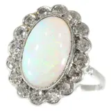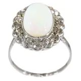 This exquisite vintage engagement ring from the 1950s, crafted in lustrous platinum, showcases a harmonious blend of opulence and elegance. It features a magnificent cabochon opal, weighing approximately 4.10 ct, ensconced amidst 16 old mine brilliant cut diamonds totaling around 1.12 ct. The ring embodies the era's transition towards more personalized and distinctive jewelry designs, combining the timeless allure of diamonds with the enchanting iridescence of opal. This piece is a testament to the romantic spirit of the time, offering a unique and sophisticated expression of love and commitment.